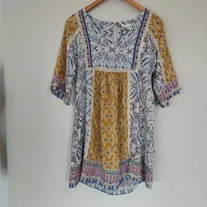 Vibrant mini dress with intricate patterns. Features a mix of yellow and blue hues. Comfortable and stylish for any occasion.