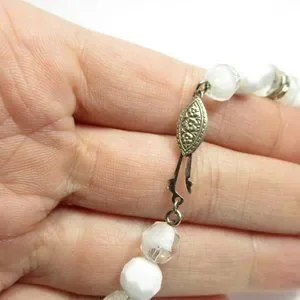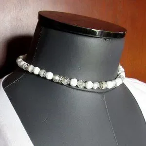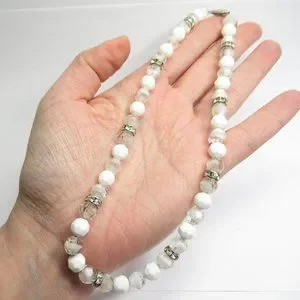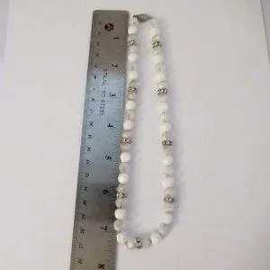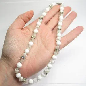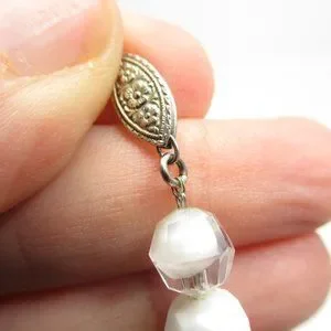 This listing is for a vintage Napier 8mm white glass and clear glass bead necklace. This necklace has a 14.75" choker size inside. The clasp is marked NAPIER on the inside. It is in good used vintage condition. This necklace is strung on a chain and appears to be in original condition.