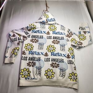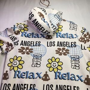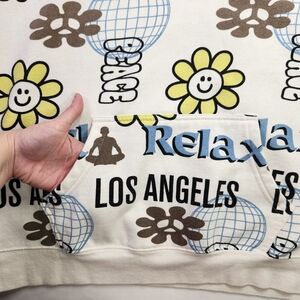 Make a bold statement in this eye-catching PacSun hoodie featuring colorful, all-over typography with words like Peace, Relax, and Los Angeles, plus fun floral graphics throughout. The mix of playful lettering and flowers gives it that carefree, West Coast early-2000s aesthetic with a relaxed skater vibe.