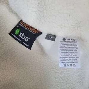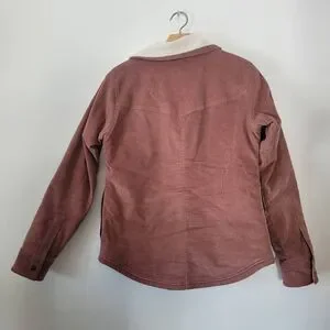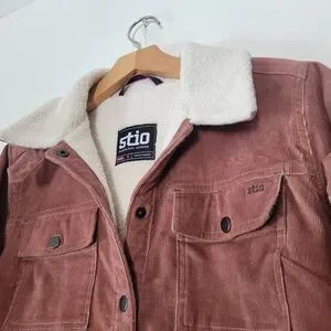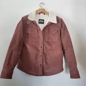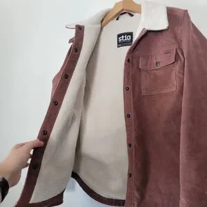 Stylish Stio jacket in mauve corduroy. Features a cozy white collar. Button-up front with chest pockets.