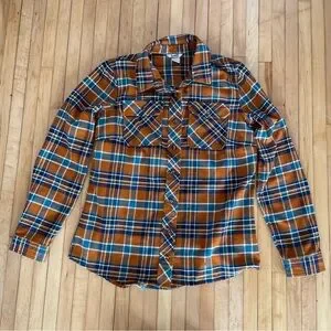 Vibrant plaid shirt jacket by Duluth. Features a striking mix of orange, blue, and white. Ideal for casual wear.