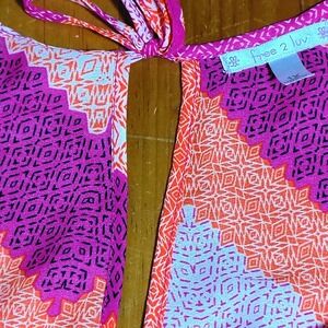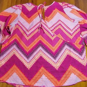 Free 2 Luv Women 1X Chevron Print Tie Neck Blouse Pink Orange Boho festival