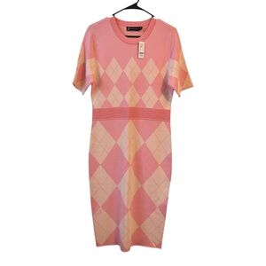 NWT NY & Co Argyle Short Sleeve Knit Sweater Dress Women’s SZ Medium in Pink