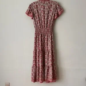 Elegant floral midi dress by Max Studio. Perfect for any occasion. Flutter sleeves, button front top with tie at waist. Base color is coral with blue, green and cream floral pattern. Very good condition.