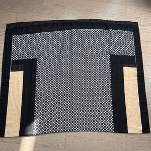 Stylish scarf with a geometric pattern. Features black and beige colors. Perfect for adding a chic touch to any outfit.