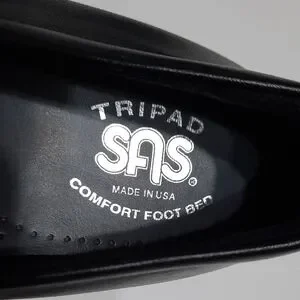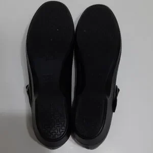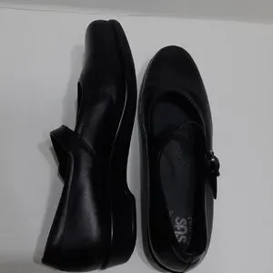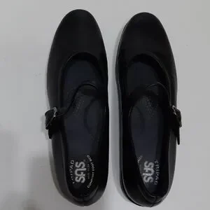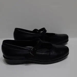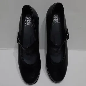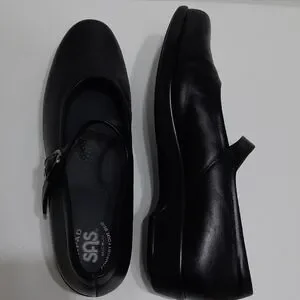 Classic black Mary Jane flats by SAS Sz 8.5M with 1" rise/heel height. Straps for closure/support. Tri pad comfort foot bed. Comfortable and stylish for everyday wear.
