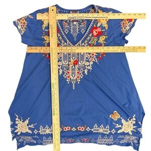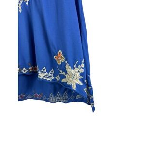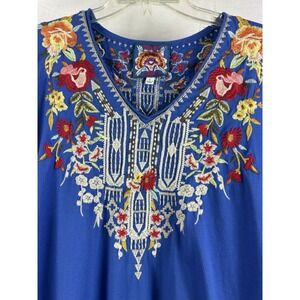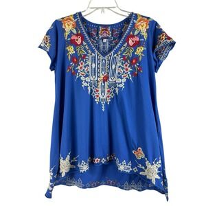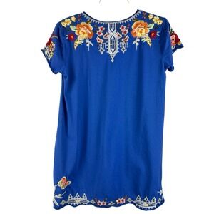 The Johnny Was IZORA Knit Drape Embroidered Cotton Top in size small is a boho-inspired blouse perfect for festivals. With a V-neckline, short sleeves, and a pullover closure, this blue top is made of lightweight cotton knit fabric. The embroidered accents add a touch of whimsy to the design, making it a versatile piece for the summer, fall, or spring seasons. Ideal for women looking for a bohemian, peasant-inspired top to add to their wardrobe.