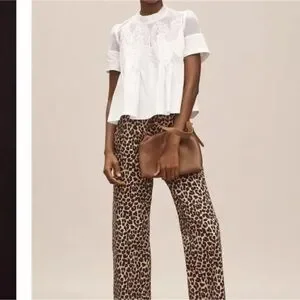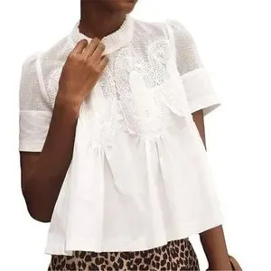 Women Lace-Detail Flared Blouse Short-Sleeve Crew Neck Lace Poplin Mesh