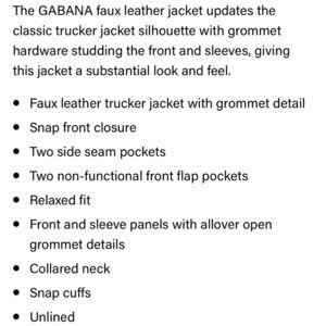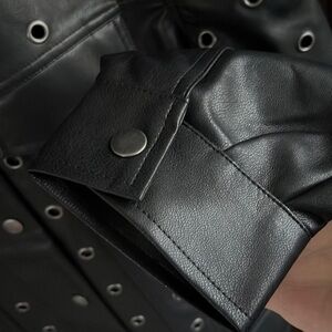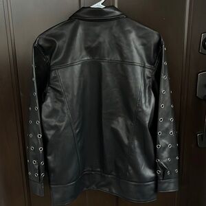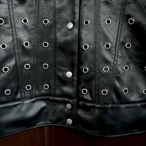 New with tag; Gorgeous black faux leather that looks and feels like real leather; snap front; grommet accents; pockets; faux chest flap pockets; pit to pit measures approx. 20” across; shoulder to hem measures approx. 25”; oversized and would fit a size small and medium too; smoke free home. p