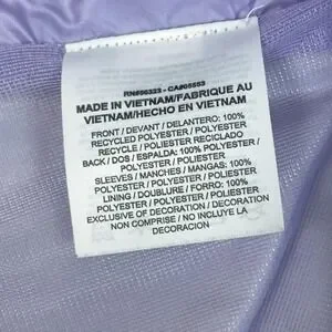 Material: Front panel 100% recycled polyester; back, sleeves, and lining 100% polyester; made in Vietnam; RN 56323; CA 05553.