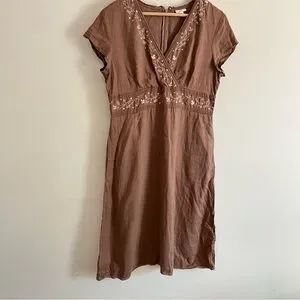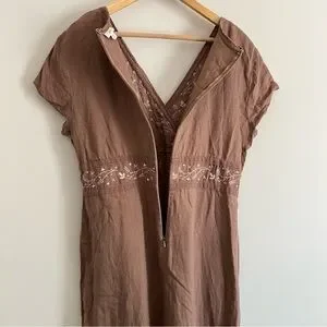 J. Jill Linen Dress Embroidered, Soft Neutral Brown With Pockets Womens Size 12