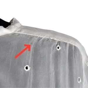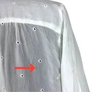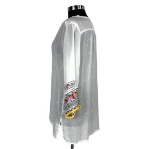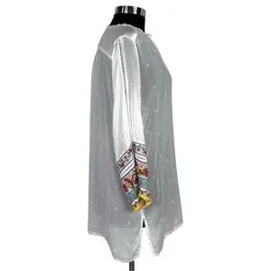 DETAIL: QUARTER BUTTON PULLOVER. BELL ¾ SLEEVES WITH HEAVY EMBROIDERY AT CUFFS. SEMI SHEER. UNLINED.