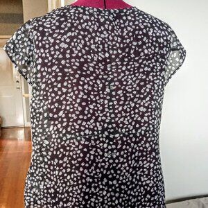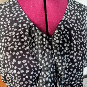 Crisp black and white print top from Relativity features a ruffled front and cap sleeves.