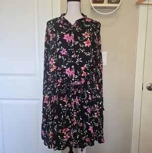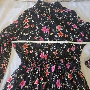 Beautiful and feminine, this Free People “Lighten Up” mini dress features a black base with a soft pink floral pattern. Designed in a relaxed shirtdress silhouette, it offers both comfort and style. Perfect for spring and summer events.