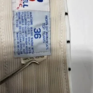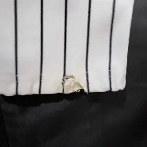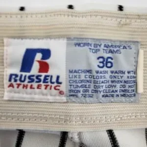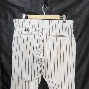 Russell Athletic baseball pants in a classic white and black pinstripe pattern offer a professional look for the diamond. These performance-ready trousers feature a double-snap waistband with a heavy-duty zipper fly and an elasticized interior waistband for a secure, comfortable fit. Designed with two set-in back pockets and reinforced knees, they provide the durability needed for sliding and active play. Note that these pants show signs of heavy use, including staining on the legs and a tear at the bottom hem as pictured.