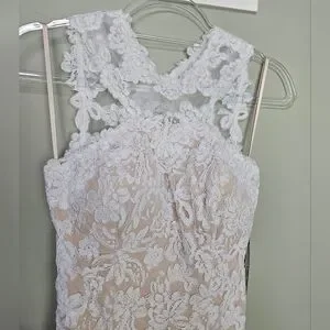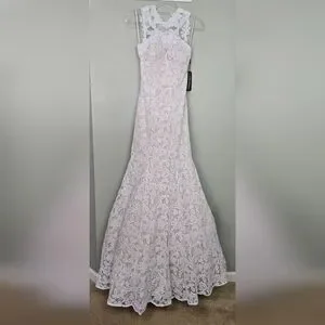La Femme Women's Long White Lace Mermaid Sheer Halter Neck Gown, Size 0