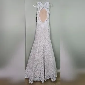 Sophisticated lace mermaid gown with a sheer halter neckline and large keyhole open back. Back zipper closure.