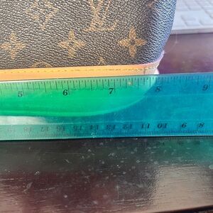Elegant bucket bag with classic monogram design. Features brown leather and tan accents. I changed leather straps. There is some wear to edges - see pics.