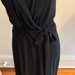 This elegant black ankle length dress is perfect for any occasion. Its sleek and sexy design offers a flattering fit, making it a must-have in your wardrobe. Plunging v-neck in front and back. Grecian twisted straps. Ties at the waist! Dress it up or down - not clingy- amazingly comfortable!