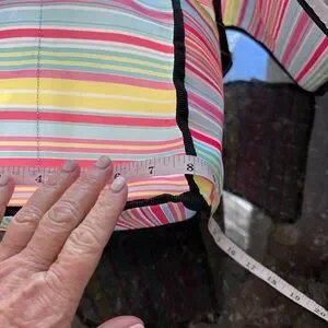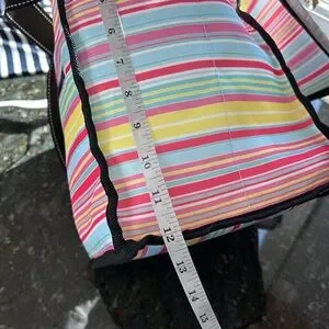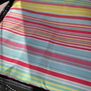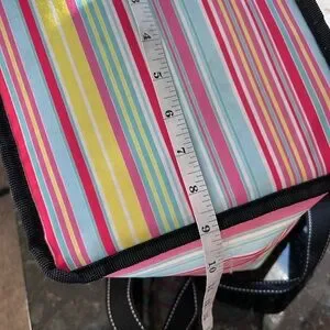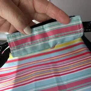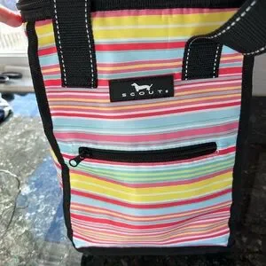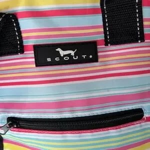 This colorful cooler bag is in excellent condition. There are just a few very light scuffs on bottom exterior and interior. So light they didn’t really show up on pics. Overall in practically new condition.