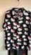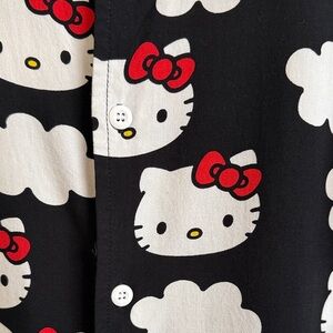 Charming Hello Kitty button down shirt. Features playful black and white design with cute Hello Kitty faces.