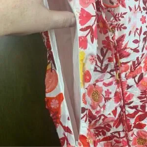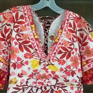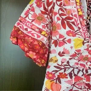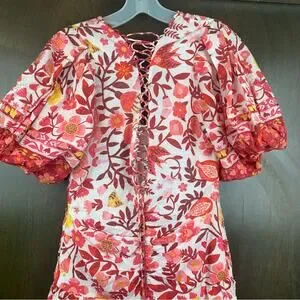 Farm Rio Romantic Orchard tiered midi dress. Size extra small. Good used condition. lace up back. Step into elegance with this bohemian floral maxi dress. Featuring a vibrant mix of red and yellow, it's perfect for any occasion.
