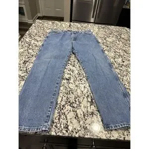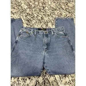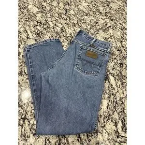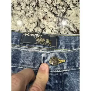 The Wrangler Jeans for men in size 35x30 feature a classic Cowboy Cut Original Fit design in blue denim. The jeans have a mid-rise waist and a straight style, with a 5-pocket design including button and zipper accents. Made of comfortable cotton fabric with easy-care properties, these jeans are perfect for all seasons and have a Southwestern cowboy theme. Part of the Wrangler George Strait Collection, these jeans are a timeless and versatile addition to any wardrobe.