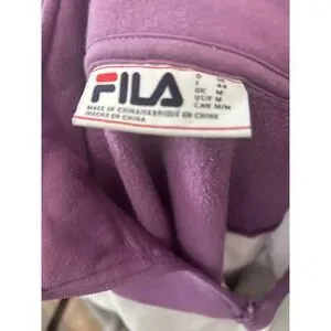 Fila quarter-zip sweatshirt in a stylish colorblock chevron design featuring purple, white, and grey tones. This sporty pullover includes a mock neck with a branded F-box zipper pull and a matching logo patch on the chest. Elasticized cuffs and hem provide a comfortable, secure fit, making it an ideal choice for athleisure wear or casual outings. Crafted from a soft fleece-lined fabric for added warmth.