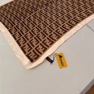 Chic Fendi scarf with a tan monogram on a cream base. Adds sophistication to any look.