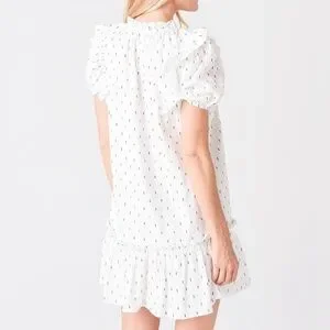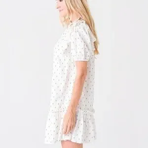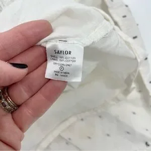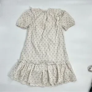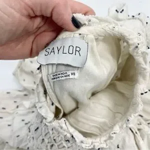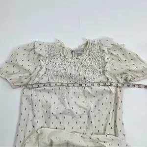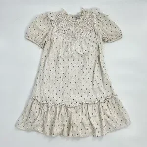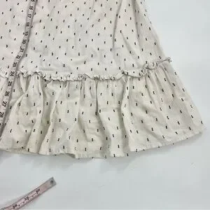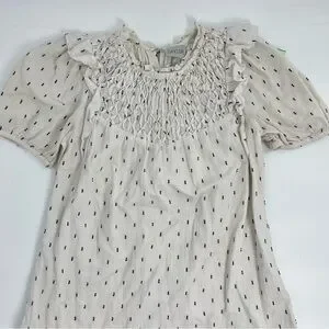 SAYLOR Women's Zella Smocked front Cotton Preppy Minimalist Short Dress XS. It is more of a cream color linen look as opposed to white. Has navy blue embroidered slash marks. ruffle hemline and dainty smock front.