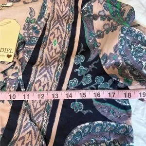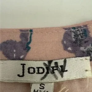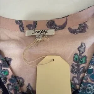 Beautiful Jodifl Los Angeles boho maxi dress in size Small. Features a soft blush background with navy, teal, and lavender paisley floral print. Flattering lace-up V-neckline, 3/4 bell sleeves with border trim, and a flowy tiered silhouette. Fully lined for comfort (rayon shell, polyester lining). Perfect for spring, summer, or festival season. Easy to dress up with wedges or keep casual with sandals. New with tags!