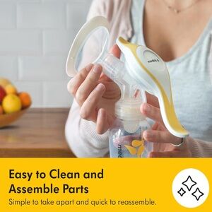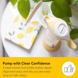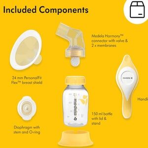 Medela Harmony Manual Breast Pump, Compact Swiss Design with PersonalFit Flex Shields and Medela's 2-Phase Expression Technology. Compact Medela manual pump in vibrant yellow. Features easy-clean parts and portable design.