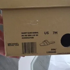 Elegant Michael Kors slide sandals. Features brown and dark brown tones. Ideal for casual wear. New in box