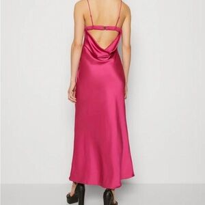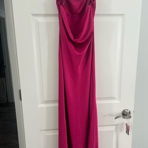 Chic strapless design. Bold fuchsia color. Perfect for standout style. I wore this to two weddings so just want to retire it. It's a lovely dress tho! No stains and it's satin.