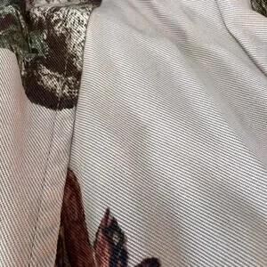 The color is close to dusty pink or old rose with beautiful floral hues of red, orange, brown, yellow, black and green.