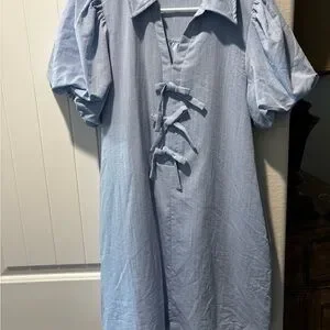 Chic blue midi dress with puff sleeves. Features a stylish tie-front design. Perfect for any occasion. Purchased from a local boutique worn once.