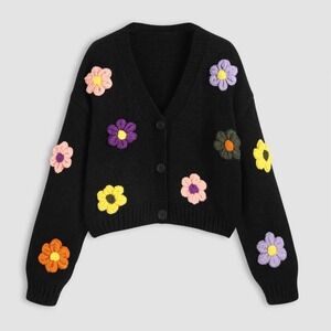 Charming black knit cardigan features vibrant 3D crochet flower appliqués in a variety of pastel and bright colors. Designed with a classic V-neckline and a three-button front closure, this cozy sweater offers a relaxed fit with dropped shoulders and ribbed cuffs and hem. The soft polyester knit provides warmth while the whimsical floral details add a playful, cottagecore aesthetic to any outfit. I think it could use a good fabric shave.