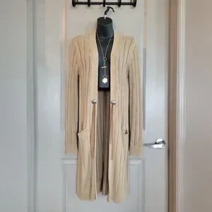 RL black label! 159. USD MSRP. SP but nice and long body and sleeves. Stay cozy and stylish with this elegant tan long cardigan sweater. Perfect for layering, this sweater adds a touch of sophistication to any outfit.