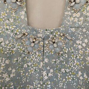 Beautifully lined, chiffon dress with detailed beading at the neckline and the back. Open back dress with side zipper. Size 4