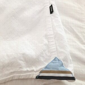 Crisp white designer Hugo Boss button down dress shirt. Blouse features distinctive light blue contrast lining in the collar and yolk along with striped side panels on either side at the hem. Lightly textured and subtle geometric pattern throughout. Fitted and tailored for a figure flattering slim fit. Sharp, chic look for the workplace or office. Made from organic cotton.