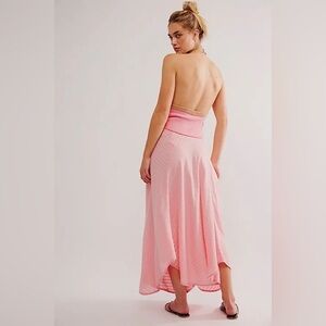 Chic maxi dress in vibrant pink with peach accents. Features a halter neckline and flowing silhouette. Ideal for sunny days.