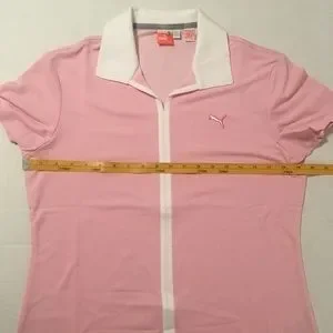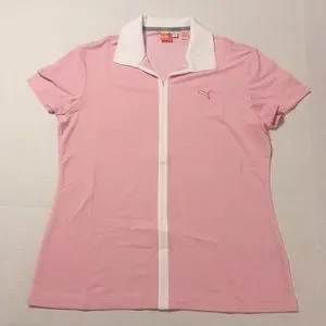 Stylish pink short sleeve polo. Features classic collar. Puma logo on chest.