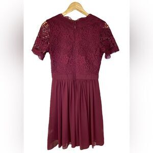 Lulus Women's Angel in Disguise Lace Fit and Flare Skater Dress. Size Small. Beautiful lace style bodice and sleeves. Back zipper and the dress is lined under chiffon overlay. The color is a dark burgundy. Excellent preowned condition.