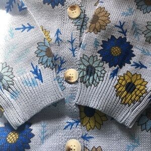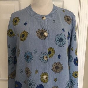 Chic sky blue knit floral cardigan button front sweater by Misslook. Soft and stylish. Sz L Lg. Great transitional spring piece. Longer length. Cotton blend.