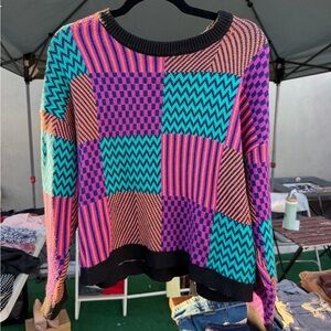 Vibrant patchwork sweater with geometric patterns. Features a mix of purple, blue, orange, and pink colors. Perfect for a bold fashion statement.
