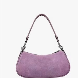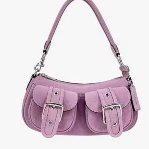 COACH NWT -used stock photos because the I didn’t want to open it, but I will if requested. It’s a suede and smooth leather shoulder and crossbody style bag featuring distinctive dual front buckle pockets.