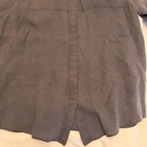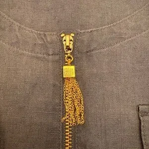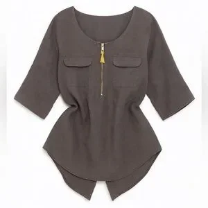 The Ellen Tracy tunic in a sophisticated gray hue features a modern asymmetrical design with a chic zippered front. Its 3/4 sleeves and boxy silhouette offer a stylish yet comfortable fit, making it a versatile addition to any wardrobe. Perfect for both casual and semi-formal occasions, this top effortlessly combines elegance with contemporary flair.