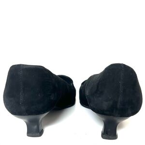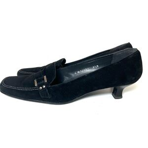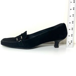 Black suede kitten heel loafer perfect for office or casual wear. There is some wear on the back of the heels. Comfortable shoes.