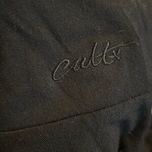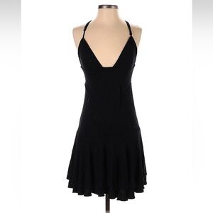 Elegant black halter dress. Features a flared skirt. Perfect for evening wear.