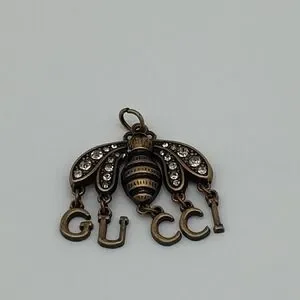 GUCCI Crystal Bee Logo Charm Pendant Antiqued Gold Rhinestone Dangle Zipper Pull